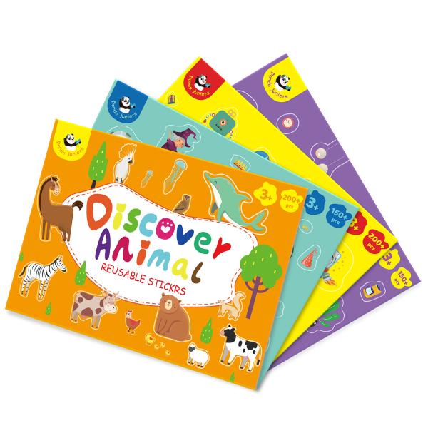 LARGE REUSABLE STICKER BOX: Includes 4 colorful backgrounds and 200-plus repositionable stickers in each package. 4 packages of rich and varied theme stickers are included in a whole set, they're Discover Animals, Discover Science, Dress up and My Lovey Home.